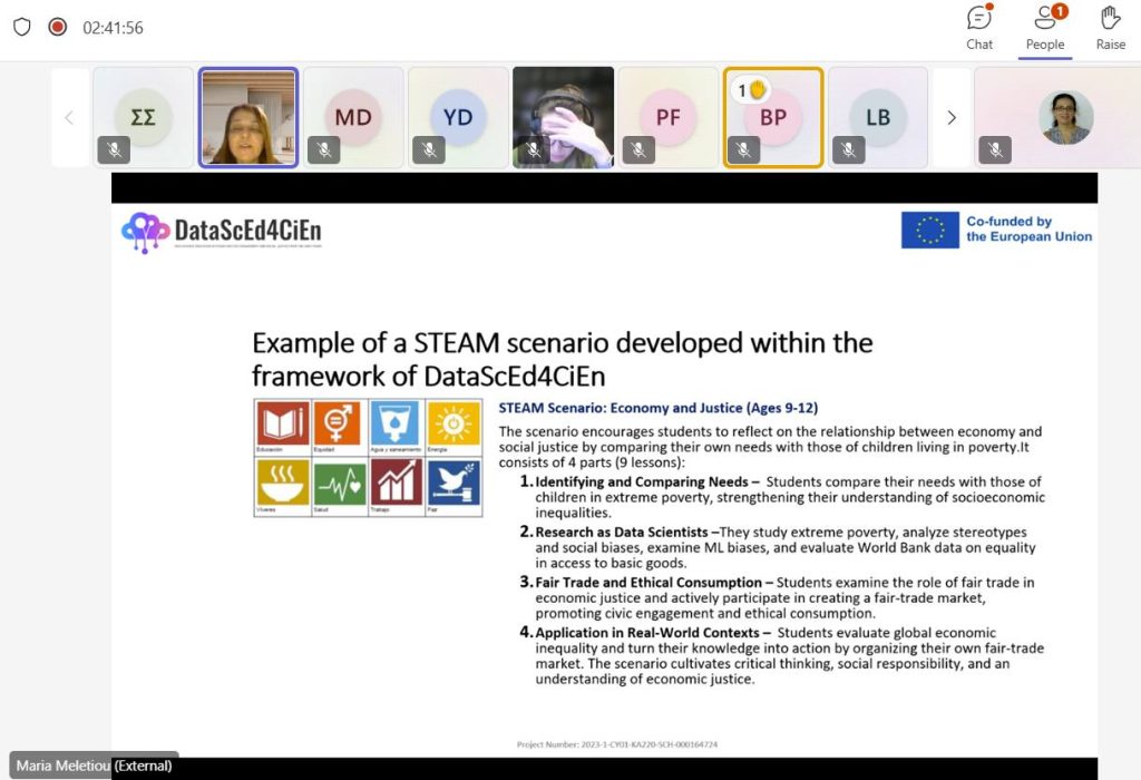 A key highlight of the session was the presentation of a STEAM learning scenario, “Economy and Justice” (ages 9–12), developed by project partner La Salle-Buen Consejo. This example illustrated how data science, social justice, and interdisciplinary learning can be effectively combined in classroom practice.